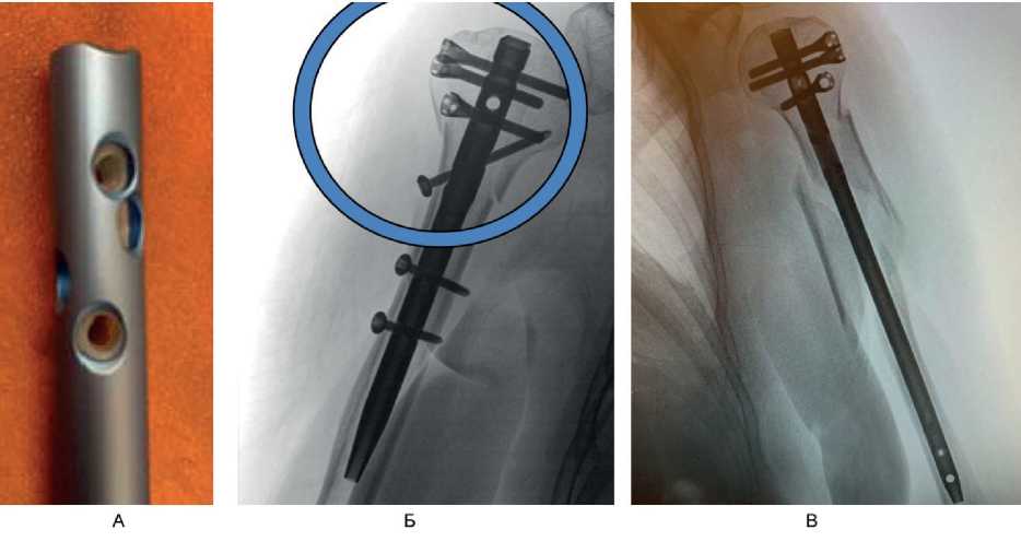 Рис. 11. Интрамедуллярный штифт. А – полипропиленовый вкладыш внутри канала штифта; Б – медиальная стабильность обеспечена введением винта через штифт в калькарную область плечевой кости; В – длинная версия штифта