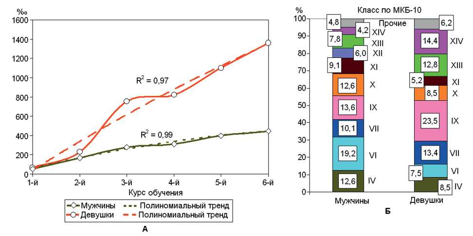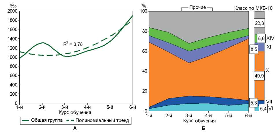 Полиномиальный тренд при высоком коэффициенте детерминации показывал увеличение уровня общей заболеваемости всех обследованных курсантов (рис. 1А). Если на 1-м курсе уровень общей заболеваемости был 960,5 ‰, то на 6-м курсе – 1896,6 ‰, увеличение – в 2 раза. В динамике структуры отмечается увеличение долей VI, X и XIV классов болезней, уменьшение долей – VII и XII классов (см. рис. 1Б).