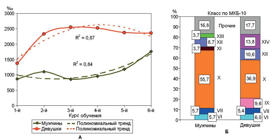 Учитывая особенность набора на обучение в ВМедА, заключающегося в приеме на обучение девушек, проведен сравнительный анализ заболеваемости курсантов с разделением по половому признаку. При высоких коэффициентах детерминации полиномиальные тренды общей заболеваемости мужчин демонстрировали U-кривую, девушек – инвертированную U-кривую с увеличением показателей в последний период обучения (рис. 2А). Например, если на 1-м курсе уровни заболеваемости курсантов-мужчин и девушек были 867,8 и 1376,7 ‰, то на 6-м курсе – 1762,3 и 2360,0 ‰, увеличение – в 2 и 1,7 раза соответственно.
