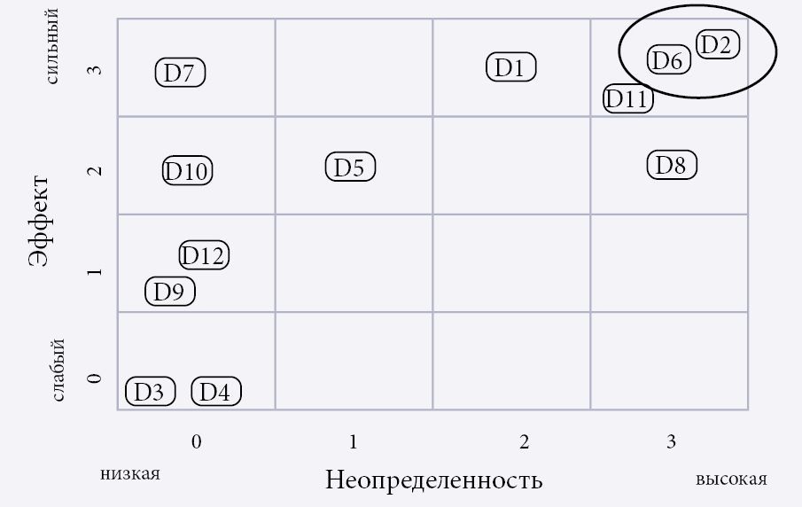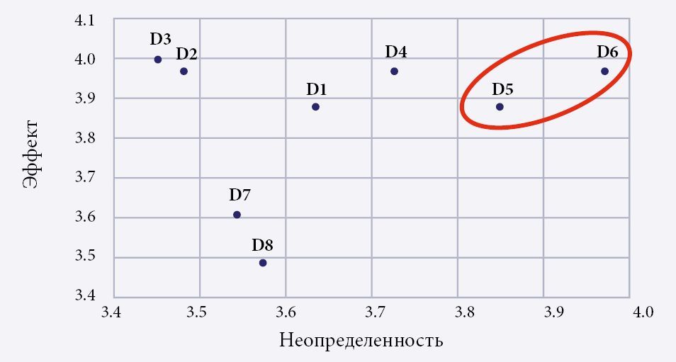 На рис. 2 красным кругом выделены факторы, ответственные за максимальные величины эффекта и неопределенности и обозначенные кодами D5 («Игровой процесс и погружение») и D6 («Технические проблемы алгоритмов ИИ»). Они стали основой для сценарного анализа.