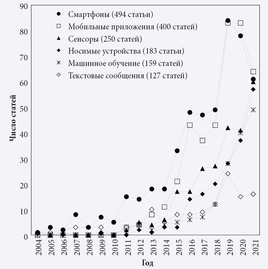 Наконец, тема «Передача текстовых сообщений» (127 статей) описывает коммуникацию через аналоговые или цифровые сети. Автоматическая генерация персонализированных сообщений напоминает пациентам о своевременном контроле уровня глюкозы, стимулирует к физической активности (Aguilera et al., 2020; Kundury et al., 2020).