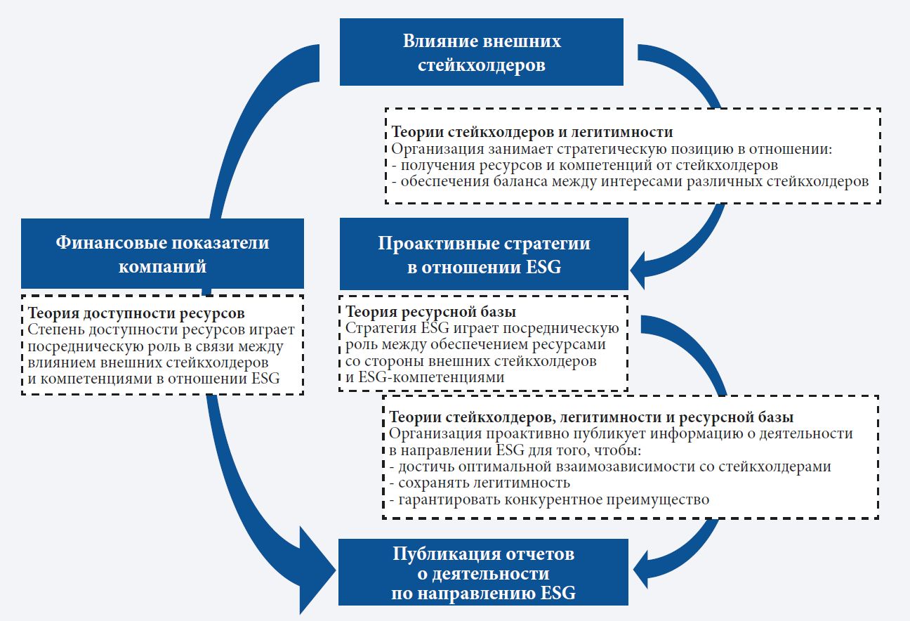 Согласно теории легитимности, внешние стейкхолдеры, не имеющие прямого контроля над ресурсами (например, СМИ и НПО), могут вынудить фирму обнародовать больше ESG-информации на основании институциональной легитимности своих требований и нормативных полномочий. Тем самым теория легитимности заслуживает включения в концептуальную структуру. По сути, как теория стейкхолдеров, так и теория легитимности углубляют понимание практики раскрытия ESG-информации через введение уникальных факторов с разным уровнем детализации (Gray et al., 1996). Таким образом, степень влияния стейкхолдеров зависит от меры их контроля над ресурсами и институциональными полномочиями по внедрению в корпоративную практику норм и ценностей (Gomes, Gomes, 2007).