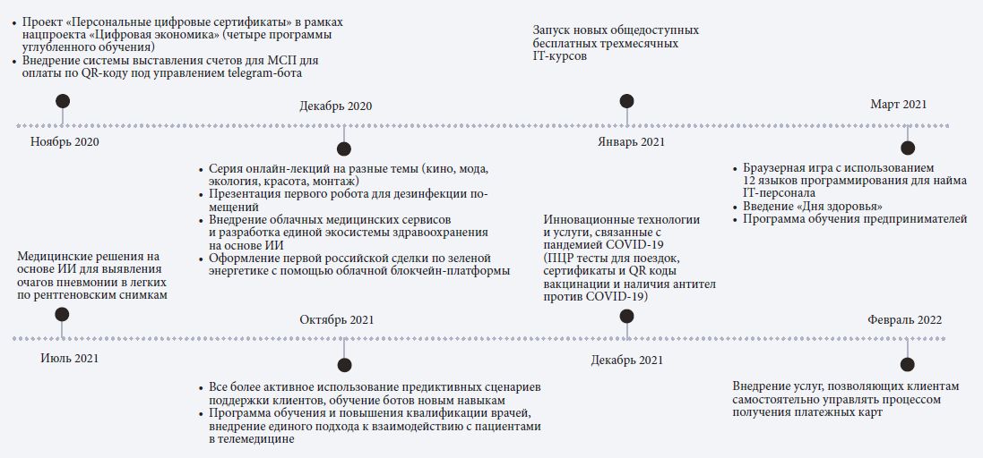 Затем банк объявил о планах дальнейшего развития облачных медицинских сервисов, включая разработку единой экосистемы на основе ИИ. Внедрив несколько блокчейн-приложений, он стал первым из российских финансовых учреждений, подключившихся к платформе Федеральной налоговой службы. С конца декабря 2020 г. действует облачная блокчейн-платформа «зеленой» сертификации для проверки источников происхождения энергии, направленная на развитие возобновляемой энергетики. В рамках социальной поддержки один из обследованных банков в середине января 2021 г. внедрил аналитический алгоритм, способный диагностировать COVID-19 по кашлю, а также запустил новые общедоступные бесплатные трехмесячные IT-курсы.