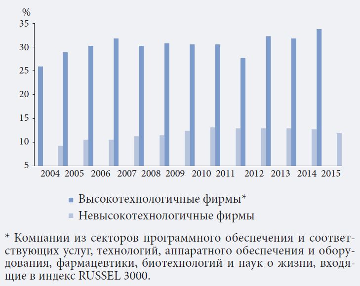Наблюдаемый в настоящее время глобальный рост доли фирм с нулевым долгом наиболее выражен в отраслях, связанных с производством программного обеспечения, фармацевтической и биотехнологической продукции. Причины столь консервативной долговой политики в них до конца не раскрыты. Вопрос состоит в том, как эти компании сохраняют эффективность, не прибегая к заемным средствам и сопутствующим налоговым вычетам (налоговому щиту). На материале американских фирм из индекса RUSSELL 3000 за 12 лет авторы показывают, каким образом высокотехнологичные фирмы обходятся без заемного финансирования, и прослеживают факторы нулевой долговой нагрузки. Разделение выборки на подгруппы высокотехнологичных и невысокотехнологичных компаний продемонстрировало разницу в мотивах отказа от долга компаний из передовых и традиционных секторов.