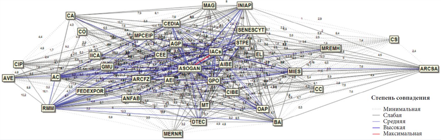 Проблемы в области долгосрочного территориального планирования выявлялись с учетом различных точек зрения. Один из фундаментальных аспектов состоит в выработке консенсуса между субъектами, имеющими разные взгляды на развитие системы и различающиеся по степени влияния на нее. На практике максимальным весом (в терминах коэффициента влияния Qi)4 обладают Ассоциация скотоводов Санто-Доминго (Qi = 1.7), муниципальные рыночные сети (Qi = 1.6), другие ассоциации производителей (Qi = 1.5) и Министерство сельского хозяйства и животноводства (Qi = 1.5). Значения индикаторов рассчитывались с учетом результатов совпадения и расхождения третьего порядка, что отражает прямое и косвенное (через третьих лиц) влияние (Chung, 2009).
