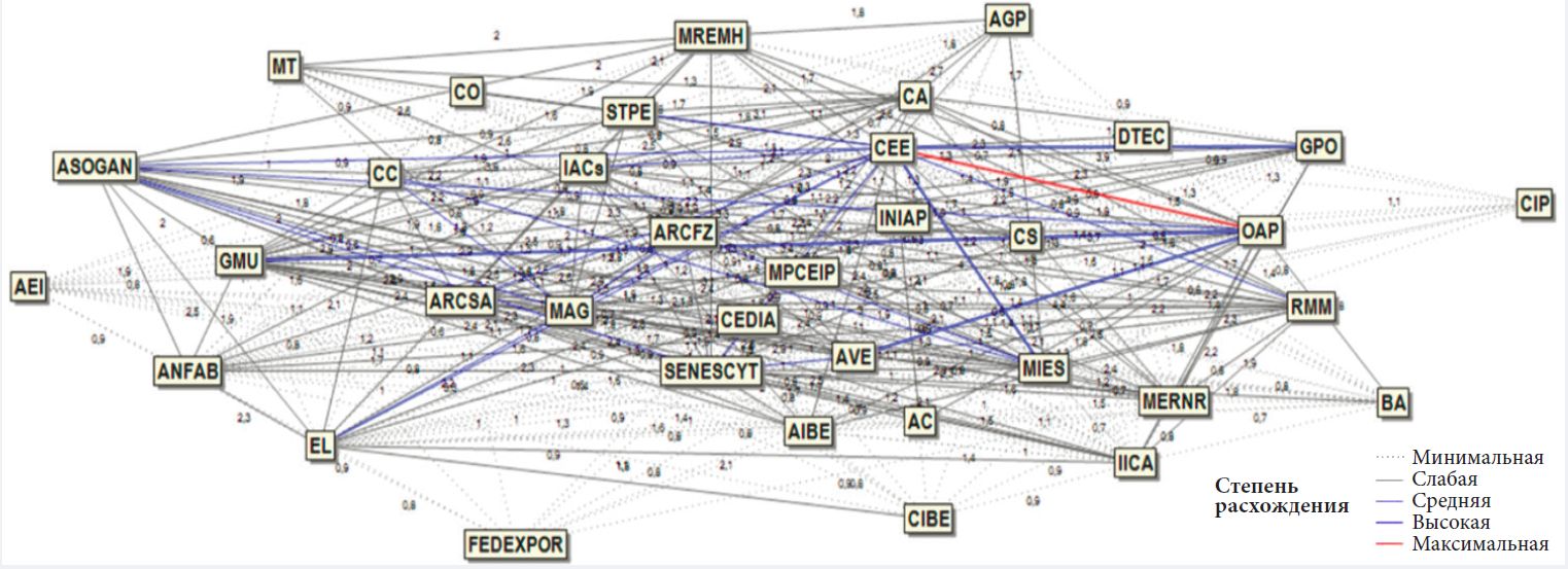 Для дальнейшего выявления совпадений и расхождений между позициями участников системы были построены графики соответствия (рис. 3) и несоответствия субъектов (рис. 4). Наибольшее соответствие было выявлено для Ассоциации скотоводов Санто-Доминго, муниципальных рыночных сетей, Министерства сельского хозяйства и животноводства, Национального секретариата высшего образования, науки, технологий и инноваций, академического сектора и Национального автономного института инвестиций в сельское хозяйство. Совпадение позиций оценивалось с точки зрения связей между местными и национальными институтами и академическим сектором, плотность которых свидетельствует о необходимости (и потенциале) выработки государственной региональной политики на основе консультаций с научным сообществом. Напротив, самые значительные расхождения наблюдаются в позициях Эквадорского комитета по делам бизнеса (CEE), Ассоциации экологической стоимости (AVE) и другими профессиональными объединениями производителей, провинциальными и муниципальными органами власти. Максимальное расхождение было выявлено между местными и региональными игроками, что подтверждает многообразие представлений о перспективах ABNSDT. В этой связи представляется целесообразным разработать инструменты территориального планирования с временным горизонтом выше краткосрочного и планировать развитие ABNSDT на основе инновационной стратегии, учитывающей положение Санто-Доминго в национальном и международном контексте.