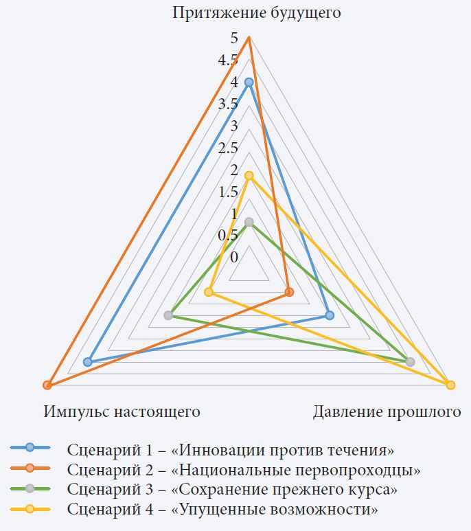 Треугольник будущего 2.0 выступает ценным инструментом артикуляции нарративов о будущем. По итогам первого раунда интерактивной дискуссии некоторые аспекты различных сценариев получили одинаковые оценки. Чтобы долгосрочные сценарии отражали реальные возможности, их следовало переработать согласно методологическим рекомендациям (Fergnani, 2020). Для большей реалистичности вариантов будущего второй раунд состоял в индивидуализации нарративов. Средние значения характеристик для четырех указанных сценариев приведены на рис. 6.