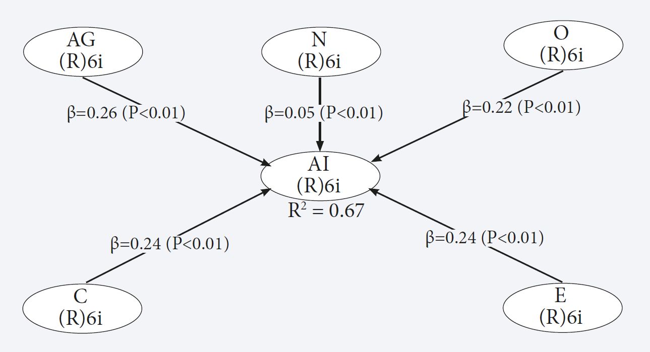 Под надежностью теста, метода или инструмента понимается степень согласованности результатов, которые можно получить с его помощью (например, путем выполнения опроса), в разных ситуациях без каких-либо модификаций (Paula, Helena, 2006). Надежность конструкций оценивалась с помощью альфы Кронбаха, отражающей силу взаимосвязи между группой элементов (Fornell, Larcker, 1981). Альфа Кронбаха всех показателей личностных характеристик превысил минимальный порог 0.70 (Fornell, Larcker, 1981), подтвердив надежность и последовательность конструкций (табл. 1). Значения данного показателя находятся в приемлемом диапазоне; минимальное (0.677) продемонстрировала переменная E — экстраверсия. Иными словами, примененные в исследовании конструкции оказались надежными (Nunnally, 1994).