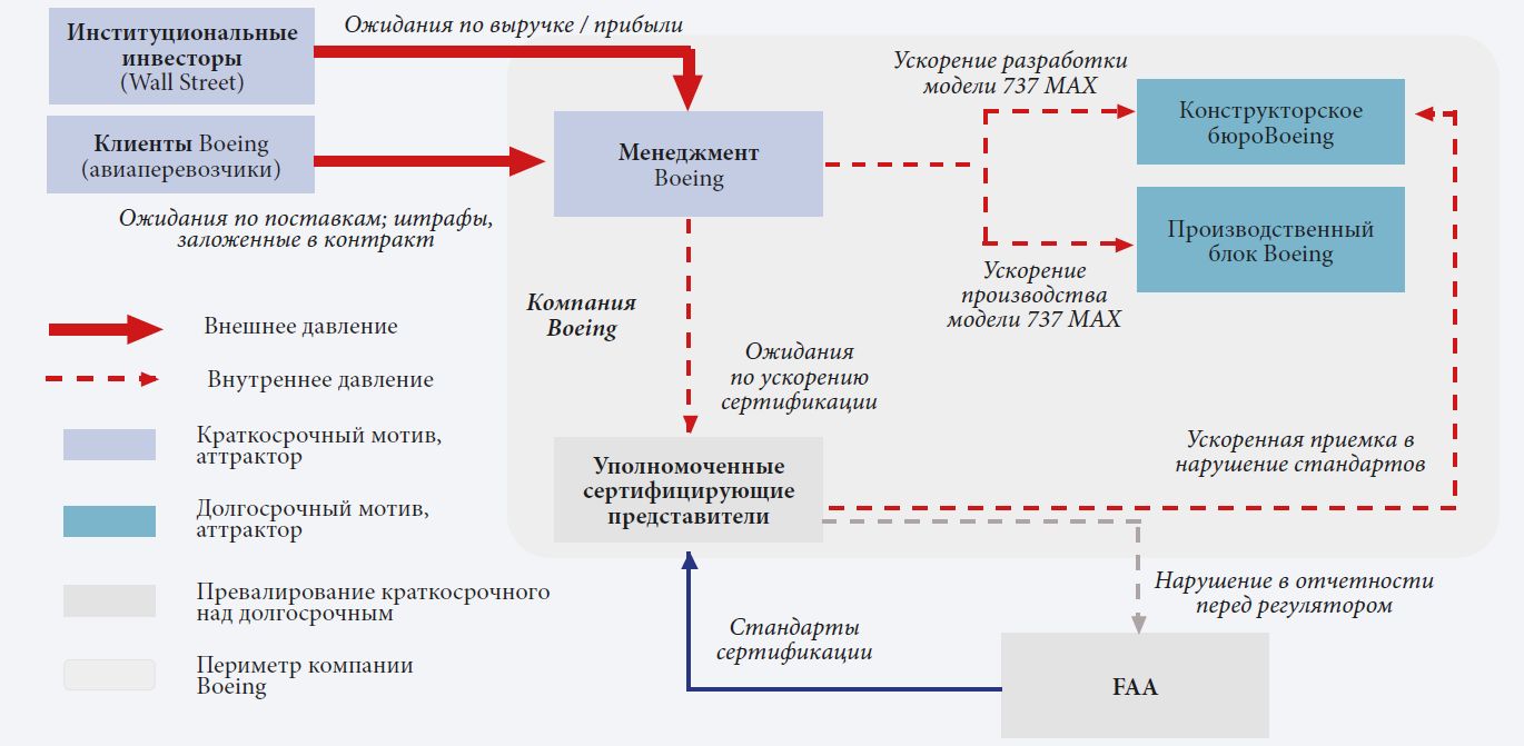 Анализ цепочки факторов, приведших к катастрофе, позволяет выстроить иерархию глубинных причин перерождения системы. Основным стал фактор смещения иерархии принципов в Boeing (обеспечение безопасности полетов отошло на второй план в угоду ставке на максимизацию финансового результата), в связи с чем произошло «укорачивание» временного горизонта стратегий. Свой вклад внесла и измененная система сертифицирования FAA (рис. 6).