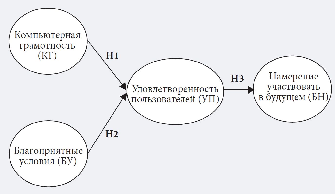 Н3. Удовлетворенность пользователей (УП) положительно влияет на намерение участвовать в электронном образовании в будущем (БН).