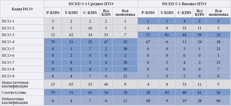 В сегменте услуг ИиР (NACE 72) лишь 28% обладателей ПТО имеют надлежащую квалификацию (химия), но существует смежная область знаний (здравоохранение), по которой профилируется значительный процент молодых специалистов. Здравоохранение как профессиональная группа подразделяется на две базовые области: персональный уход и помощь, а также техническая и лабораторная работа. Последняя тесно связана с научными исследованиями. Основные профессии носят технический характер (группы ISCO 31 и 33), включая профессионалов ИКТ (ISCO-35) и офисные кадры (ISCO-43). Наконец, доля занятых в С-KIBS, образование которых сбалансировано с должностными характеристиками, значительно ниже (21%). Для вида деятельности NACE 73 этот показатель составляет 29%, а для NACE 74 — всего 18%. Квалификационный профиль занятых в С-KIBS охватывает широкий круг дисциплин. Некоторые вакансии в компаниях с видом деятельности NACE 74, занимаемые лицами с ПТО, например ISCO-92 (уборщики) или ISCO-59 (охрана), далеки от основных видов С-KIBS.