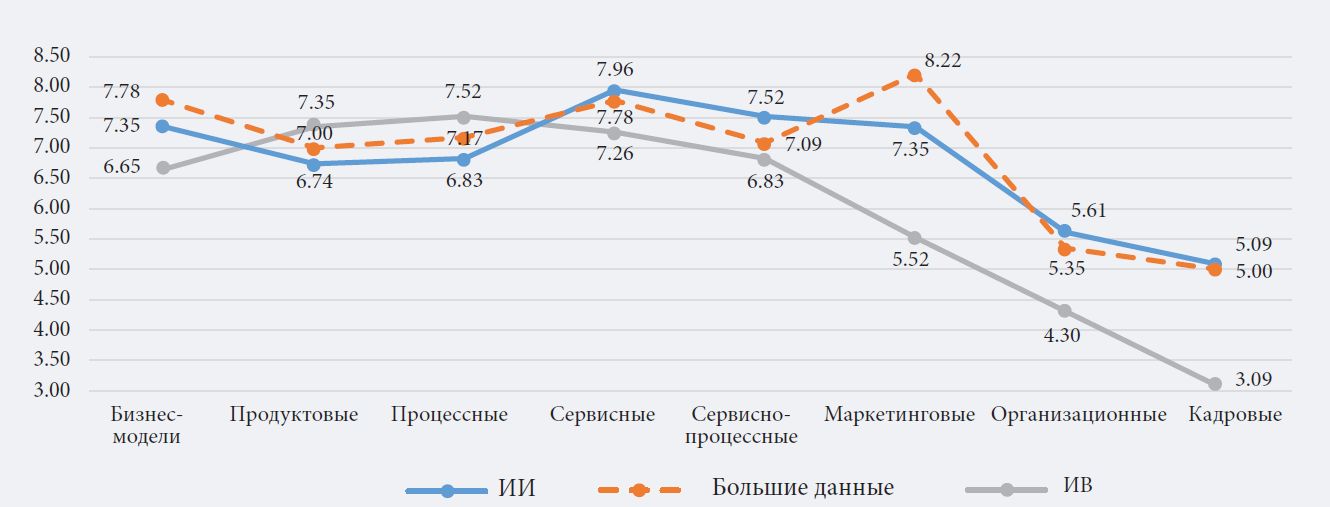 По итогам опроса Дельфи была оценена относительная значимость наиболее приоритетных технологий для каждого из восьми типов инноваций на базе средних значений, а также приоритетность типов инноваций, связанных с ИИ, большими данными и ИВ (графически представлены на рис. 4). Полученные 552 ответа из 184 анкет представляют собой данные порядкового уровня, достоверность которых следовало бы проверить с помощью теста, однако он вряд ли применим к индуктивной статистике, поскольку отбор экспертов может быть целенаправленным (о невероятностной выборке см. (Healey, 2002)). Дисперсионный анализ (ANOVA) подтвердил статистическую значимость результатов.