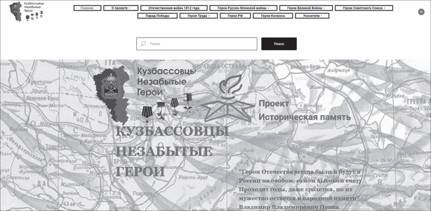 Fig. 1. The main page of the resource nazabytye-geroi.rf (unforgotten-heroes) created as part of the regional historical and patriotic project “Kuzbass citizens – Unforgotten Heroes”