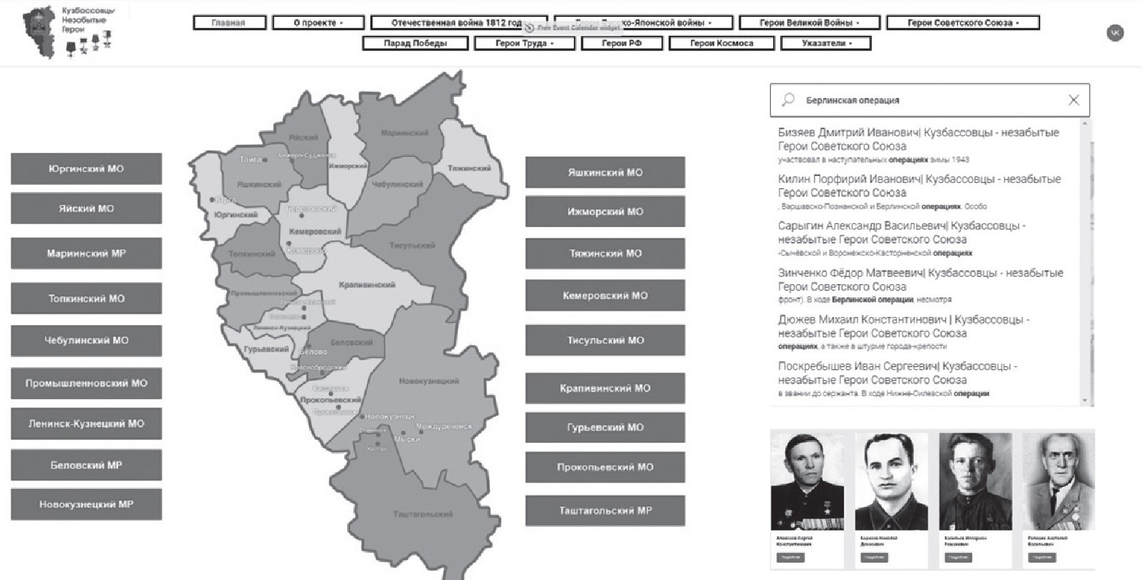 В создании первоначальной версии ресурса активное участие приняли студенты кафедр музейного дела и технологии автоматизированной обработки информации и систематизации Кемеровского государственного института культуры. Ресурс постоянно пополняется новыми материалами – биографиями, копиями документов о наградах и иной информацией. На данный момент содержатся материалы о 238 героях СССР, 53 полных кавалерах ордена Славы, 67 участниках Парада Победы 1945 года, 2 героях-космонавтах, 18 героях РФ, участниках Русско-японской и Первой мировой войн, а также он включает более 500 имен героев труда из Кузбасса. В декабре 2021 года была обнаружена, изучена, обработана и опубликована информация о 6 участниках Отечественной войны 1812 года – уроженцах территории региона (рис. 2).