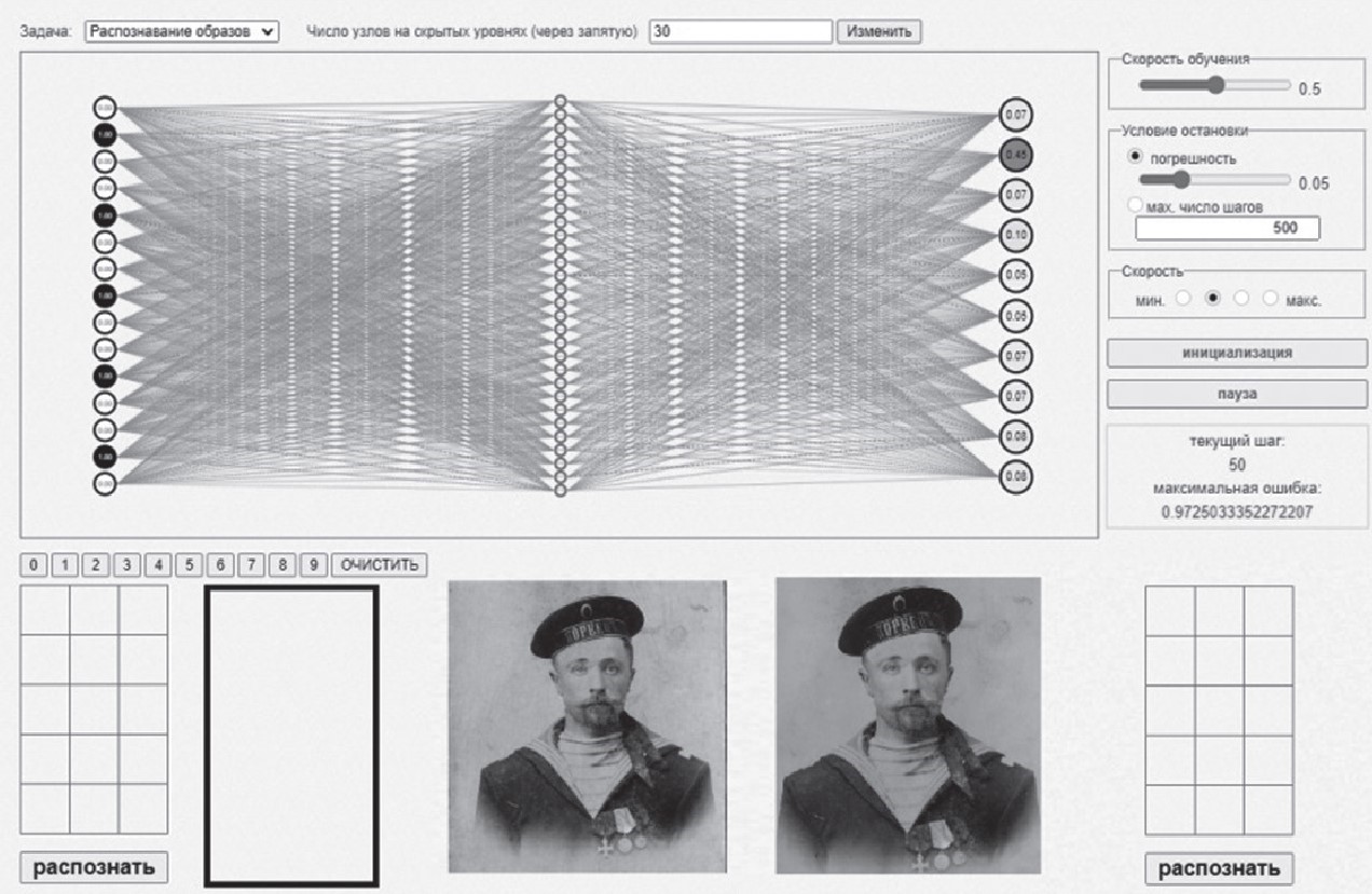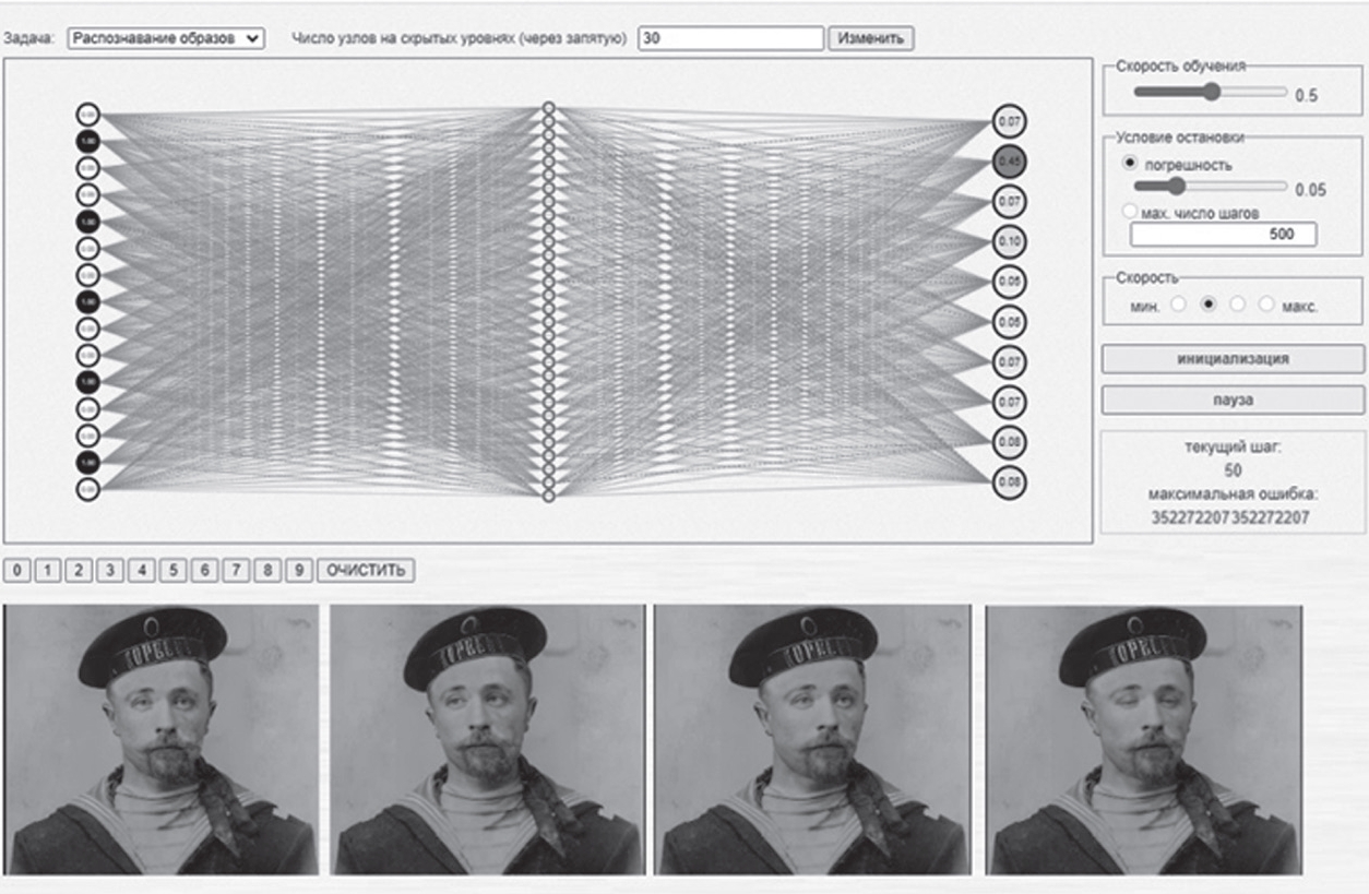 Рисунок 3. Нейронное программирование (машинная тренировка) по колоризации портретной фотографии героя Русско-японской войны 1904–1905 гг. И. П. Сырельщикова через онлайн-конструктор прикладной математики Primat.org
