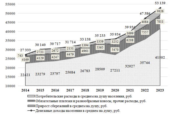 Потребительские расходы населения России в номинальном выражении в период 2014-2023 гг. заметно выросли, как и денежные доходы. В среднем на душу потребительские расходы увеличились в 2023 г. до 41502 руб. (+85,1% к 2014 г.), а денежные доходы достигли 52139 руб. (+94,4% к 2014 г.) (рисунок 1). Повысился уровень и других составляющих структуры использования денежных доходов населения. В частности, среднедушевые расходы на обязательные платежи и разнообразные взносы вместе с прочими расходами увеличились до 7811 руб. (+87,4% к 2014 г.), а прирост сбережений в 2023 г. составил 3826 руб. (рост в 5,15 раз к 2014 г.).
