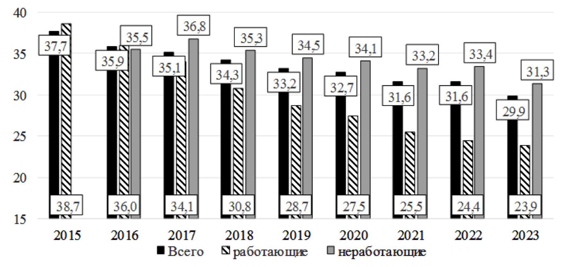 Итогом рассмотренного изменения индексационной политики является всё более значительное отставание среднего размера страховой пенсии относительно уровня средней зарплаты для всех основных категорий получателей страховых пенсий, что наиболее наглядно отражается в динамике показателя «солидарный коэффициент замещения» [2; 3]. Солидарный коэффициент замещения средней страховой пенсии по старости снизился с 37,7% в 2015 году до 29,9% в 2023 году, а для неработающих пенсионеров – с 35,5% в 2015 году до 31,3% в 2023 году. Таким образом, выявленная тенденция ставит под угрозу достижение целевого ориентира в 40% по данному показателю к 2030 г. даже для ограниченной категории неработающих пенсионеров (рисунок 2).