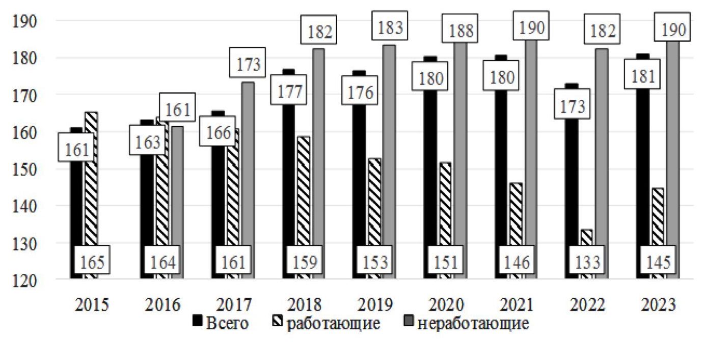 Динамика соотношения страховой пенсии по старости и прожиточного минимума пенсионеров (ПМП), представленная на рисунке 2, складывалась более благоприятно. Средний размер страховой пенсии по старости по всем получателям увеличился на 18% со 163% ПМП в 2016 году до 181% ПМП в 2023 году, для неработающих – со 161% ПМП в 2016 году до 190% ПМП в 2023 году. Однако, достигнутые значения намного ниже установленного целевого ориентира в 2,5-3 ПМП.