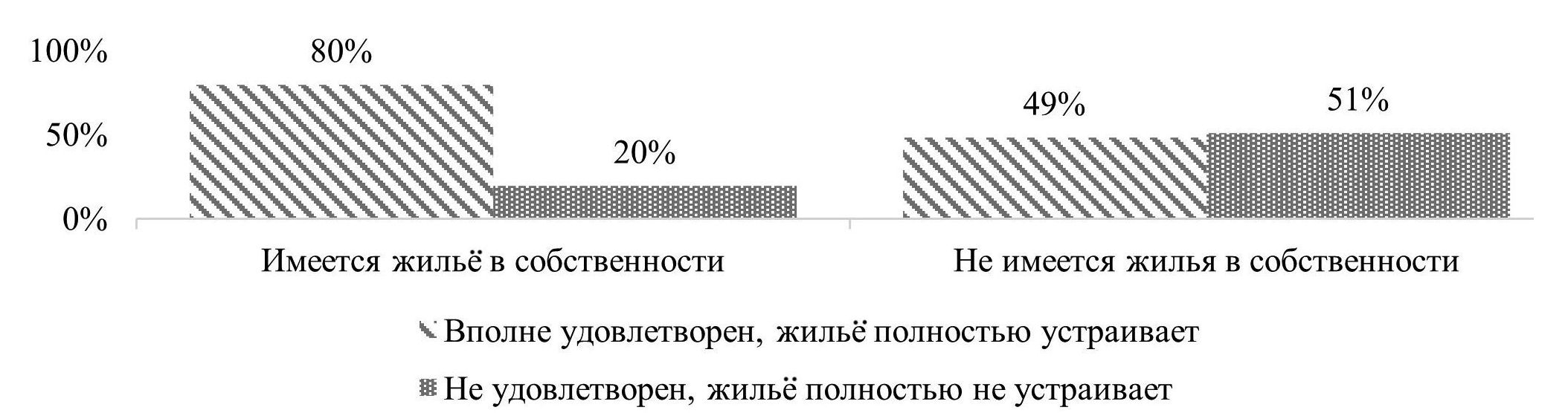 Несмотря на то, что большинство респондентов имеют собственное жильё, не все из них удовлетворены этим жильём. Неудовлетворённость имеющимся жильём в какой-то мере указывает на низкое экономическое благополучие семьи. Критическое отношение к имеющимся жилищным условиям более выражено среди тех, кто проживает не в собственном жильё (в съемном, ведомственном, по договору социального найма и т.п.). Среди тех, кто имеет собственное жильё, не удовлетворены жилищными условиями 20% респондентов, в то время как среди не имеющих жилья в собственности доля неудовлетворённых гораздо выше – 51% (рисунок 2). Можно сделать вывод, что не имеющие собственного жилья семьи нередко живут в условиях, которые их категорически не устраивают.