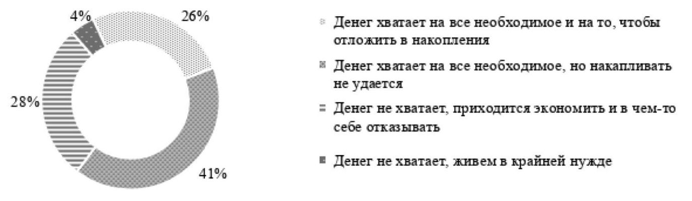 Подтверждением вывода о недостаточно высоком уровне семейных доходов части семей являются результаты анализа распределения ответов респондентов об экономической ситуации, в которой находится их семья. В благополучной экономической ситуации находятся семьи респондентов, которым денег хватает на всё необходимое. Более двух третьих респондентов (67%) отнесли себя к этой категории. В то же время семьи заметной доли опрошенных (32%) находятся в худшей экономической ситуации – 28% респондентов указали, что денег не хватает и приходится экономить и в чём-то себе отказывать, а 4% – денег не хватает, они живут в крайней нужде (рисунок 3). Таким образом, экономическое благополучие третьей части семей по показателю «экономическая ситуация, в которой находится семья» имеет негативный характер. Кроме того, для примерно каждой пятой семьи (22%) большой проблемой является наличие долгов, кредитов, ипотеки и т.д., так как их не удается вовремя оплачивать. Отсюда следует вывод, что закредитованность российских семей в заметной доле случаев смещает их экономическое благополучие по показателю «способность оплачивать кредиты» в отрицательную область.