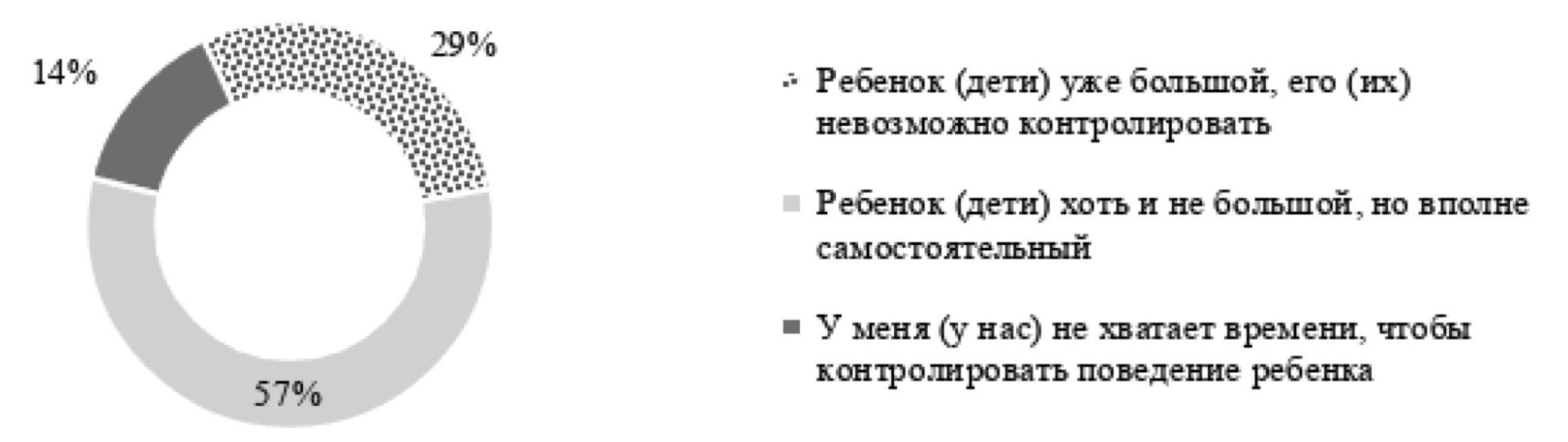 Ситуация, в которой взрослые оставляют несовершеннолетних без надзора может свидетельствовать о недостаточном социальном семейном благополучии по показателю «контроль за детьми». Такие ситуации случаются в семьях примерно половины респондентов, имеющих несовершеннолетних детей (49%). Респонденты назвали причины, по которым их дети оказываются предоставленными сами себе. В более чем в половине случаев (57%) родители не следят за несовершеннолетним ребёнком потому, что считают, что их ребёнок хоть и не большой, но вполне самостоятельный. Примерно каждый третий респондент, допускающий ситуацию отсутствия контроля за ребёнком (29%), указывает, что причина этого в том, что, его несовершеннолетний ребёнок большой, в силу чего он не может контролировать ребёнка. На нехватку времени на то, чтобы контролировать ребёнка ссылаются 14% опрошенных из числа тех, кто не контролирует детей (рисунок 5). Приведённые результаты означают, что значительное число семей по показателю «контроль за детьми» находятся в области негативного семейного благополучия.