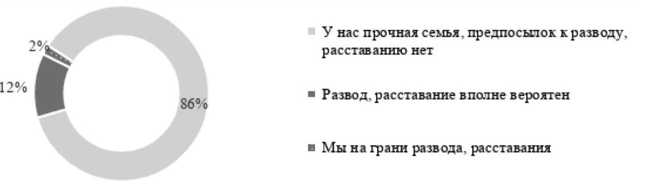 Устойчивый брак, в котором супруги не видят предпосылок к прекращению семейных отношений (разводу) свидетельствует о позитивном психологическом благополучии семьи. Мнение, что они вероятно разведутся, расстанутся со своим супругом (супругой), высказали немногим более, чем один опрошенный из десяти (12%). На грани развода, расставания находятся 2% респондентов. Таким образом, психологическое благополучие по показателю «вероятность развода» большинства семей (86%) имеет позитивный характер (развод не предполагается) (рисунок 8). В то же время, семейно-брачные отношения хоть и небольшой, но заметной части семей – неустойчивые, что свидетельствует о негативном характере их психологического благополучия.