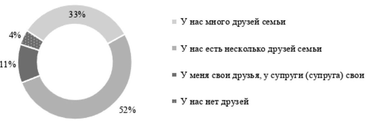 Наличие у супругов общих друзей (друзей семьи) свидетельствует об общем коммуникативном успехе семьи, что является признаком позитивного психологического благополучия семьи. Об отсутствии у семьи проблем с внешними коммуникациями заявили большинство опрошенных. Семейные коммуникационные проблемы просматриваются у 15% семей респондентов – примерно в каждом десятом случае (11%) у супругов нет общих друзей, но каждый из них из них имеет своих друзей. В 4% случаев у семей респондентов совсем нет друзей. Можно сделать вывод, что психологическое благополучие большинства семей (85%) по показателю «наличие друзей семьи» имеет позитивный характер (рисунок 11).