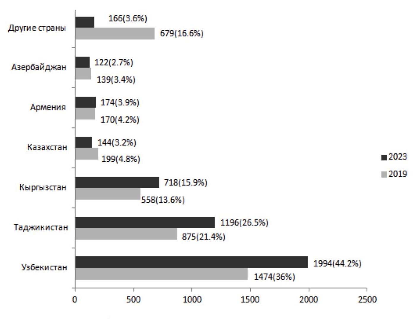 Рисунок 1. Количество прибывших иностранных граждан в Российскую Федерацию из разных стран в 2019 и 2023 гг., тыс. чел., %