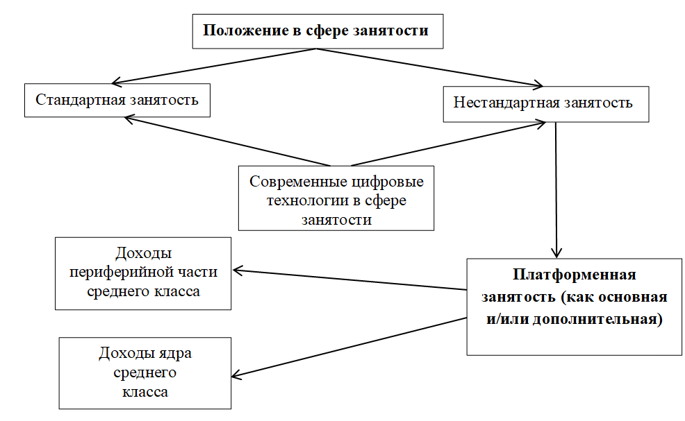 Исследование направлено на подтверждение указанной в рисунке 1 взаимосвязи между платформенной занятостью и доходами периферийной части и ядра среднего класса.
