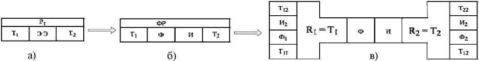 Развитие первоначальной смыслосодержащей сущности ГФ алгоритма элементарного действия осуществляется путем наделения ее свойством «интеллекта пространства», а конкретно – свойством взаимовлияния материи на геометрию и наоборот. Предполагаем, что каждый из терминов (Т1, Т2) является результатом разрешения различений внутри термина: например, Т1(Т11/Т12) и Т2(Т21/Т22). Тогда каждый из терминов может быть представлен смыслосодержащей сущностью ГФ алгоритма осуществления элементарного действия по созданию терминов (Рис. 4, в). Первоначальная смыслосодержащая сущность ГФ алгоритма подготовки элементарного действия должна и может саморазвиваться в смыслосодержащую сущность графического алгоритма преодоления разрыва.