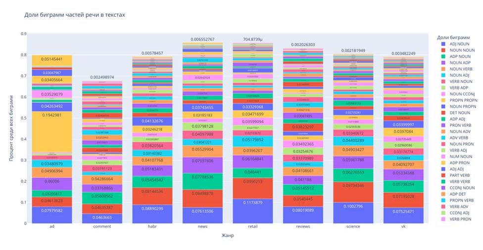 Характеристики уровня структуры представляют собой отслеживание сочетаемости частей речи в анализируемых текстах. Исследование показало, что наиболее активным является сочетание имен собственных и оно характерно в наибольшей степени для рекламных текстов (0,19). Основным для всех анализируемых текстов является сочетание прилагательного с существительным, однако частотность также варьируется в зависимости от жанра. Наиболее активны данные сочетания в описаниях компаний (0,12), далее по убывающей – научные тексты из журналов (0,10), статьи с платформы Хабр (0,088), отзывы на фильмы (0,080), реклама (0,079), новости (0,076), посты в ВК (0,075). Следующая категория сочетаний, которая является такой же частотной – это существительное + существительное. Здесь также в зависимости от жанра есть некоторые различия по частотности. На первом месте – описания компаний (0,099), далее–научные статьи в журналах (0,097), новости (0, 084), научные статьи с платформы Хабр (0,081). Наименьшее количество таких сочетаний у рекламных текстов. Следует отметить, что рекламные тексты отличаются также наименьшим разнообразием сочетаний различных частей речи. Соотношение сочетаний частей речи можно видеть на Рис. 4.