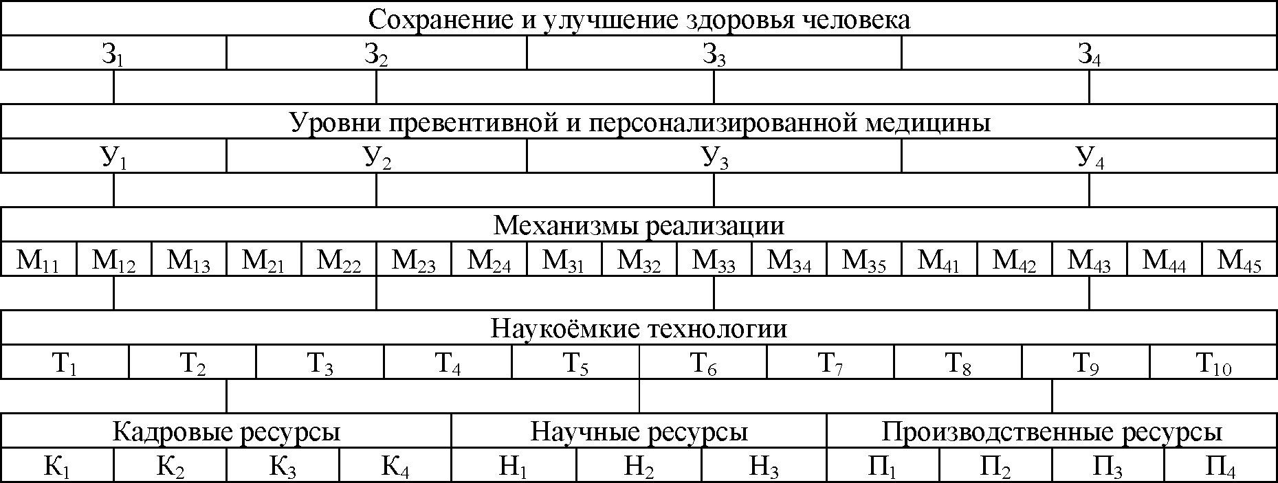 Одним из наиболее адекватных подходов, позволяющих рассмотреть тенденции развития сложной системы, является ее информационно-логическое моделирование [11]. Модель системы, представленная в виде многоуровневой иерархической структуры, – это, по сути, средство программного планирования, ориентированное на многокритериальную экспертную оценку различных вариантов стратегических решений, с помощью которого осуществляется переход от целей к средствам достижения целей и выбор возможных вариантов реализации. Многоуровневая информационно-логическая модель научно-технологического потенциала превентивной и персонализированной медицины представлена на Рис. 1.