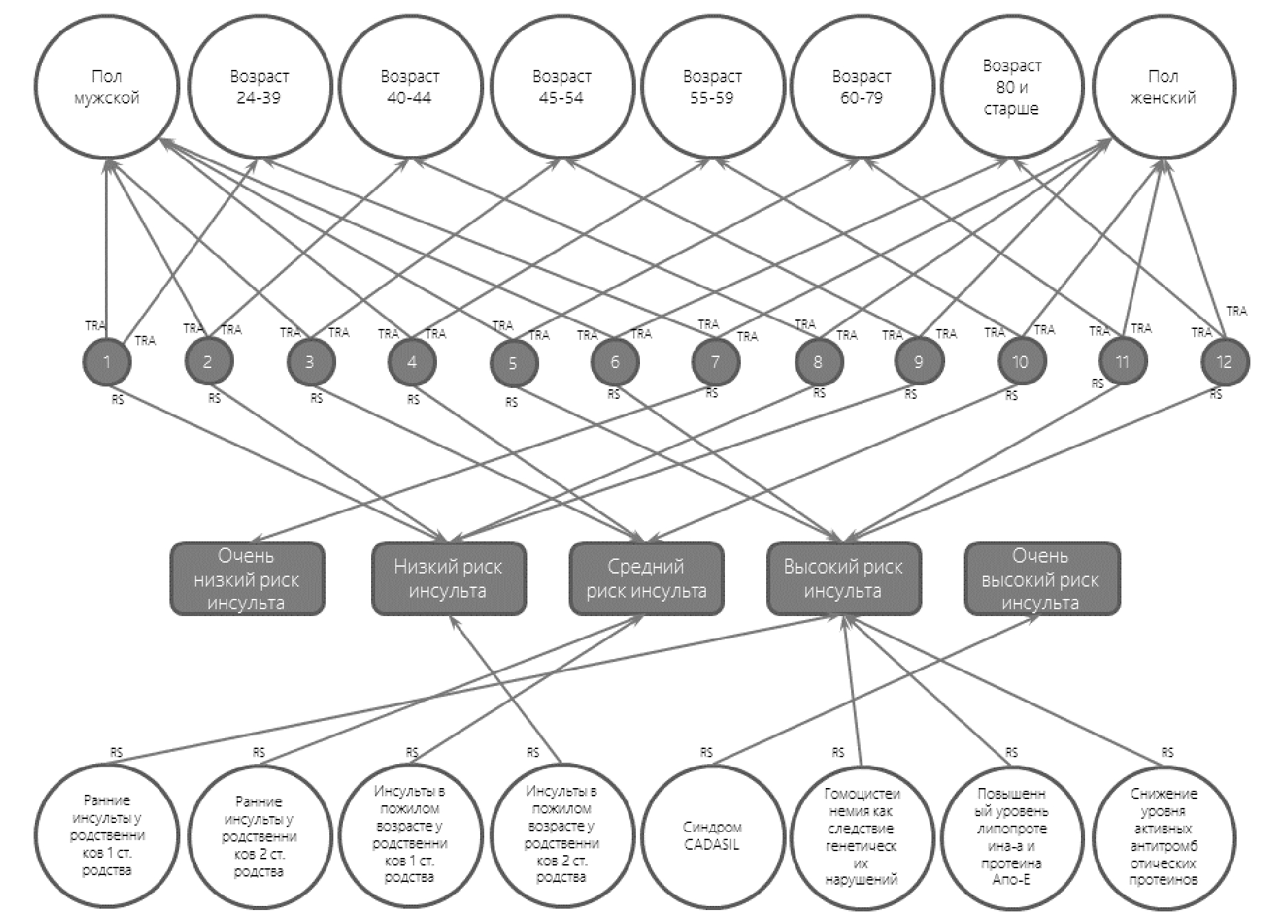 Рис. 1. Фрагмент базы знаний (TRA – связь, обозначающая, что при узле-родителе всегда наблюдается узел-ребенок. RS – связь, обозначающая, что при узле с исходящей связью может наблюдаться узел со входящей связью)