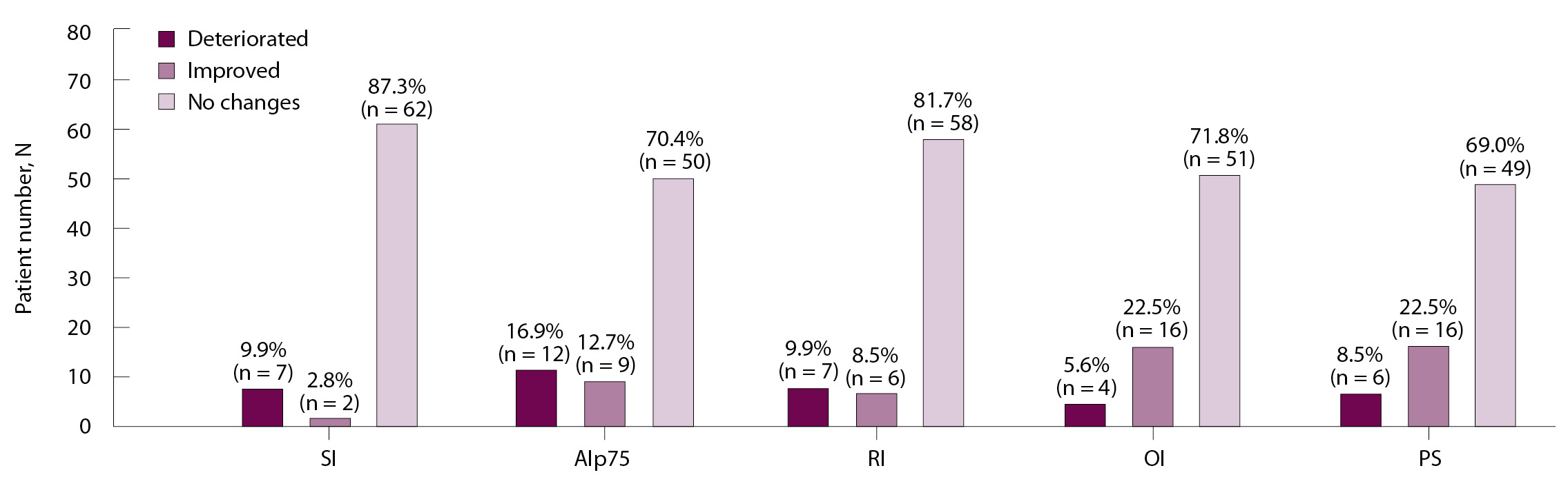 Анализ индивидуальных данных показал, что после проведения ВДХТ с аутоТГСК изменения показателей артериальной функции были разнонаправлены (рис. 2). После ВДХТ и аутоТГСК у некоторых пациентов происходило ухудшение показателей артериальной функции. Так, увеличение (ухудшение) SI отмечено у 7 (9,8%) пациентов, AIp75 – у 12 (16,9%), RI – у 7 (9,8%), снижение (ухудшение) OI – у 4 (5,6%) пациентов и PS – у 6 (7%). В то же время у небольшого числа пациентов улучшались показатели SI (n = 2; 2,8%), RI (n = 6; 8,4%), AIp75 (n = 9; 12,7%), у несколько большего количества больных улучшались показатели OI (n = 16; 22,5%) и PS (n = 16; 22,5%).
