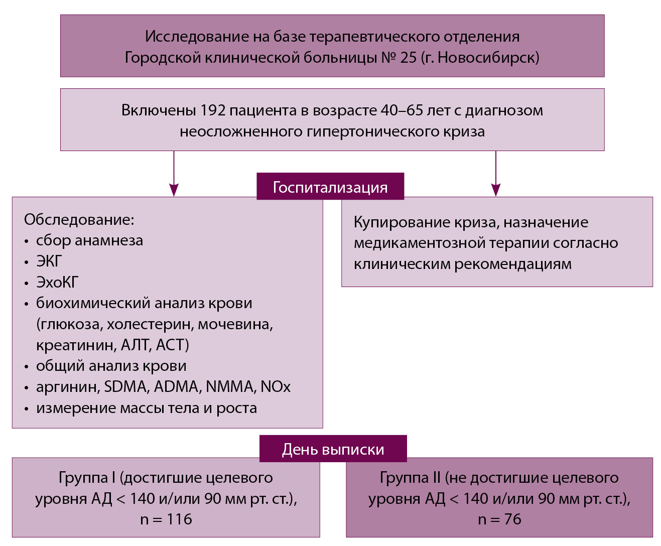 Проведено наблюдательное ретроспективное сплошное неконтролируемое исследование, в которое были включены 192 пациента в возрасте 45–65 лет, поступившие в круглосуточный стационар ГБУЗ НСО «Городская клиническая больница № 25» г. Новосибирска с ГБ по поводу неосложненного гипертонического криза в период с ноября 2017 по май 2020 г. (рис. 1). В день выписки пациенты ретроспективно были разделены на 2 группы. К первой группе отнесены пациенты, у которых удалось достичь целевого АД в течение госпитализации (группа пациентов с целевым АД, n = 116), ко второй – пациенты с неконтролируемой АГ, у которых назначение трех антигипертензивных препаратов (включая диуретик) в оптимальных или максимально переносимых дозах не приводило к достижению целевого АД ниже 140 и/или 90 мм рт. ст. в период госпитализации (группа пациентов с нецелевым АД, n = 76).