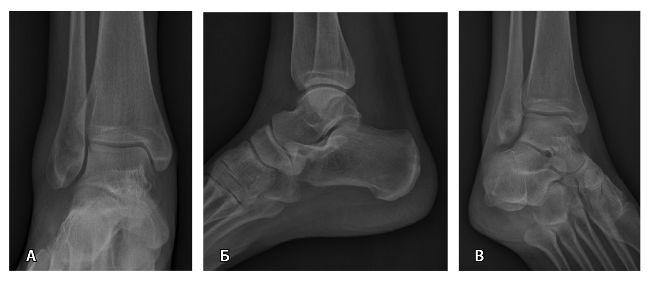 Рис. 1. Стандартный протокол рентгенографии голеностопного сустава без осевой нагрузки: А – прямая проекция; Б – боковая проекция; В – прямая проекция с внутренней ротацией стопы на 20°. Костно-травматические изменения не определяются, параартикулярные мягкие ткани не изменены