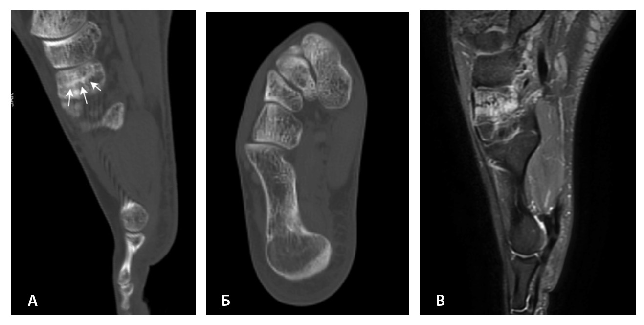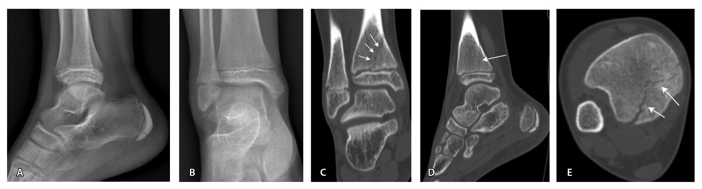 Рис. 2. Рентгеннегативный перелом дистального метадиафиза большеберцовой кости 2-го типа по Солтеру – Харрису (стрелки) у мальчика 11 лет: А, Б – рентгенография; В – компьютерная томография (КТ), корональная плоскость; Г – КТ, сагиттальная плоскость; Д – КТ, аксиальная плоскость