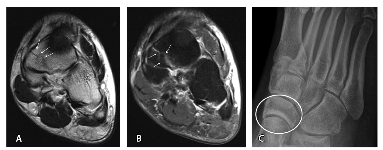МРТ – наиболее подходящий метод визуализации остеохондрального повреждения купола таранной кости с чувствительностью и специфичностью 96% [52]. В исследованиях M. Haubro и соавт. [53], M. P. Wilson и соавт. [28] МРТ квалифицирована как золотой стандарт диагностики скрытых переломов по сравнению с КТ и рентгенографией. Протокол, состоящий из корональных T1-взвешенных изображений и STIR, обладает 100% чувствительностью в выявлении рентгеннегативных переломов (рис. 3) [28].