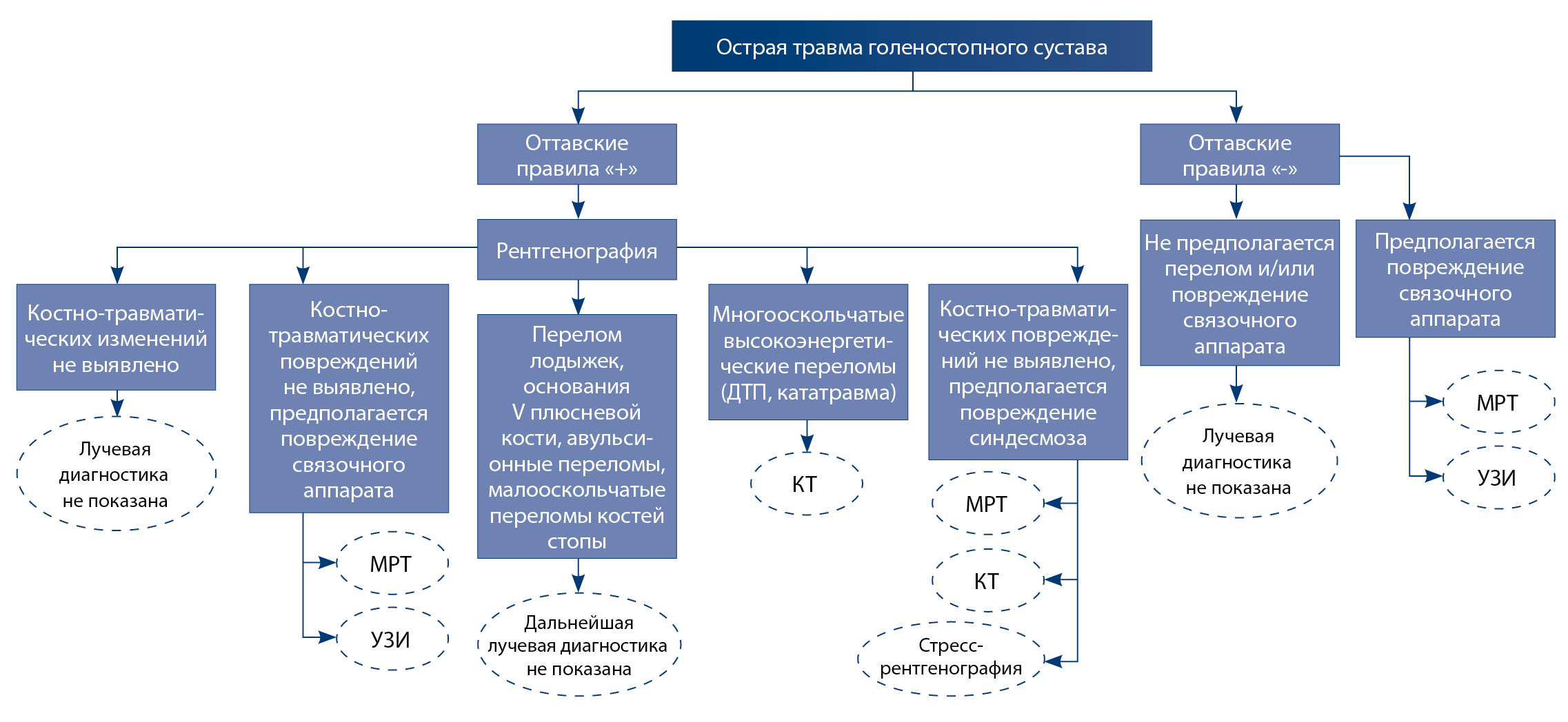 В ситуации, когда пациент с острой травмой голеностопного сустава не соответствует требованиям оценки Оттавских правил и не предполагается повреждение связочного аппарата, в том числе синдесмоза, применение лучевых методов диагностики нецелесообразно.