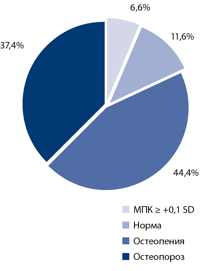 В нашем исследовании среди пациентов, которым оценка показателей МПК проводилась по Т-критерию (n = 1928), МПК ≥ +0,1 SD выявлена у 6,6% (n = 127), нормальные значения Т-критерия – у 11,6% (n = 224), «остеопения» – у 44,4% (n = 856) и «остеопороз» – у 37,4% (n = 721) (рис. 2). При этом в позвоночнике «остеопороз» диагностирован в 46% случаев и в шейке бедра – в 16,3%; «остеопения» выявлялась в 41,4 и 52% соответственно. Показатели МПК в пределах нормальных значений в позвоночнике были у 12,6% и в шейке бедра у 31,7% больных, из них значения Т-критерия ≥ +0,1 SD имели в поясничном отделе 44,1% и шейке бедра – 28,7% пациентов. В ⅓ предплечья наименьшее значение Т-критерия зарегистрировано только у 9 человек: «остеопения» – 22% (n = 2) и «остеопороз» – 77,8% (n = 7).
