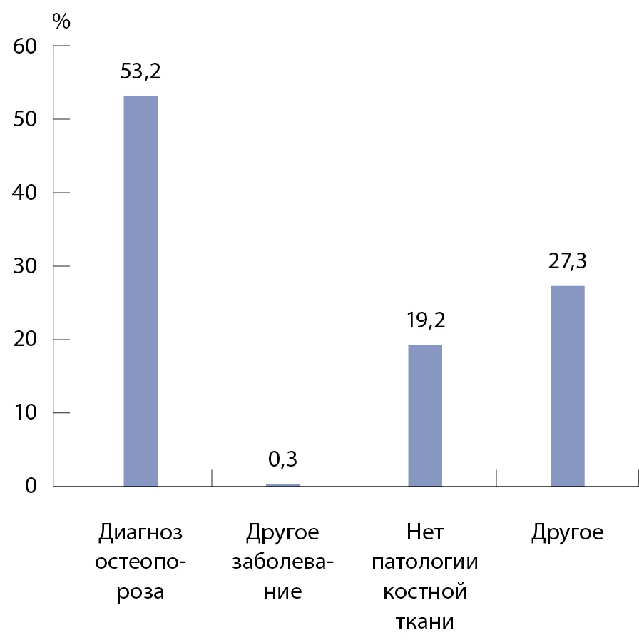 Таким образом, более чем у половины пациентов причиной обращения было получение направления на рентгеновскую денситометрию, что нецелесообразно с точки зрения использования времени врача, консультирующего в центре остеопороза. Незначительное количество пациентов, направленных терапевтами, говорит о низкой вовлеченности врачей первичного звена в работу по выявлению лиц с высокой вероятностью переломов.