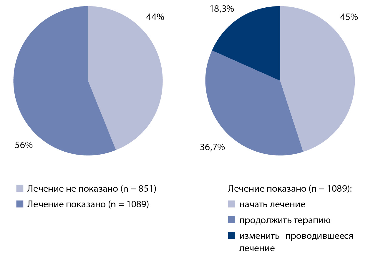 Число пациентов, которым показано терапевтическое вмешательство, составило 56% (n = 1089), из них инициировать терапию было рекомендовано 45% (n = 489), продолжить прием ранее используемых препаратов – 36,7% (n = 400), изменить тактику лечения – 18,3% (n = 200) (рис. 4). В том числе антирезорбтивная терапия назначалась при установленной костной форме первичного гиперпаратиреоза или пациентам, получающим ингибиторы ароматазы по поводу рака молочной железы с целью профилактики потерь МПК (n = 57).