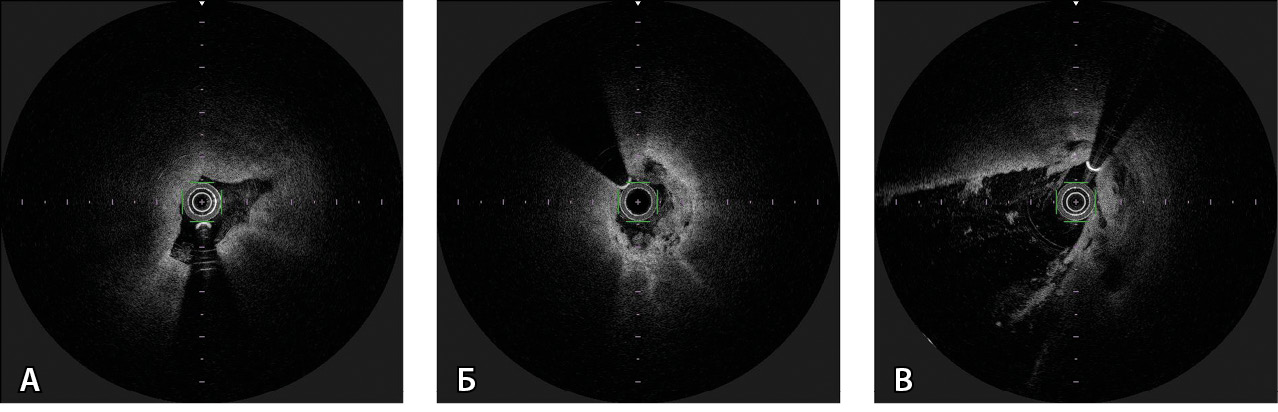 Рис. 2. Оптическая когерентная томография: поперечные срезы желчного протока в норме и при опухолевых стриктурах. А – неизмененная стенка холедоха. Желчный проток спавшийся, щелевидной формы с четкими стенками и слоями. Б – признаки злокачественной стриктуры: сужение просвета, выраженное нарушение слоистости и наличие множества гипорефлекторных зон неправильной формы. В – гипержелезистая слизистая оболочка холедоха, характерная для опухоли Клацкина