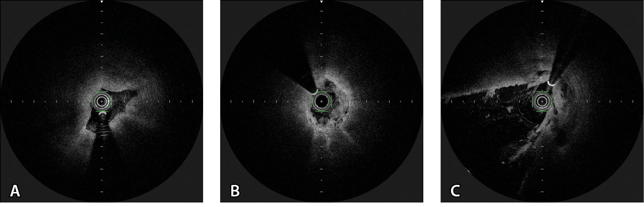 Датчик ОКТ устанавливали на проводнике через опухолевую стриктуру в тонкую кишку. В автоматическом режиме “pullback” выполняли обратную протяжку диагностического катетера (от большого дуоденального сосочка через стриктуру ворот печени до неизмененных проксимальных желчных ходов) со скоростью 40 мм/с на расстояние 150 мм. Скорость съемки составляла 158 кадров в секунду. Во время протяжки мануальным способом через боковой «рукав» интродьюсера вводили 20 мл контрастного вещества. Эта манипуляция позволяла расширить неизмененные желчные протоки, четче визуализировать ригидную стриктуру и уменьшить артефакты изображения.