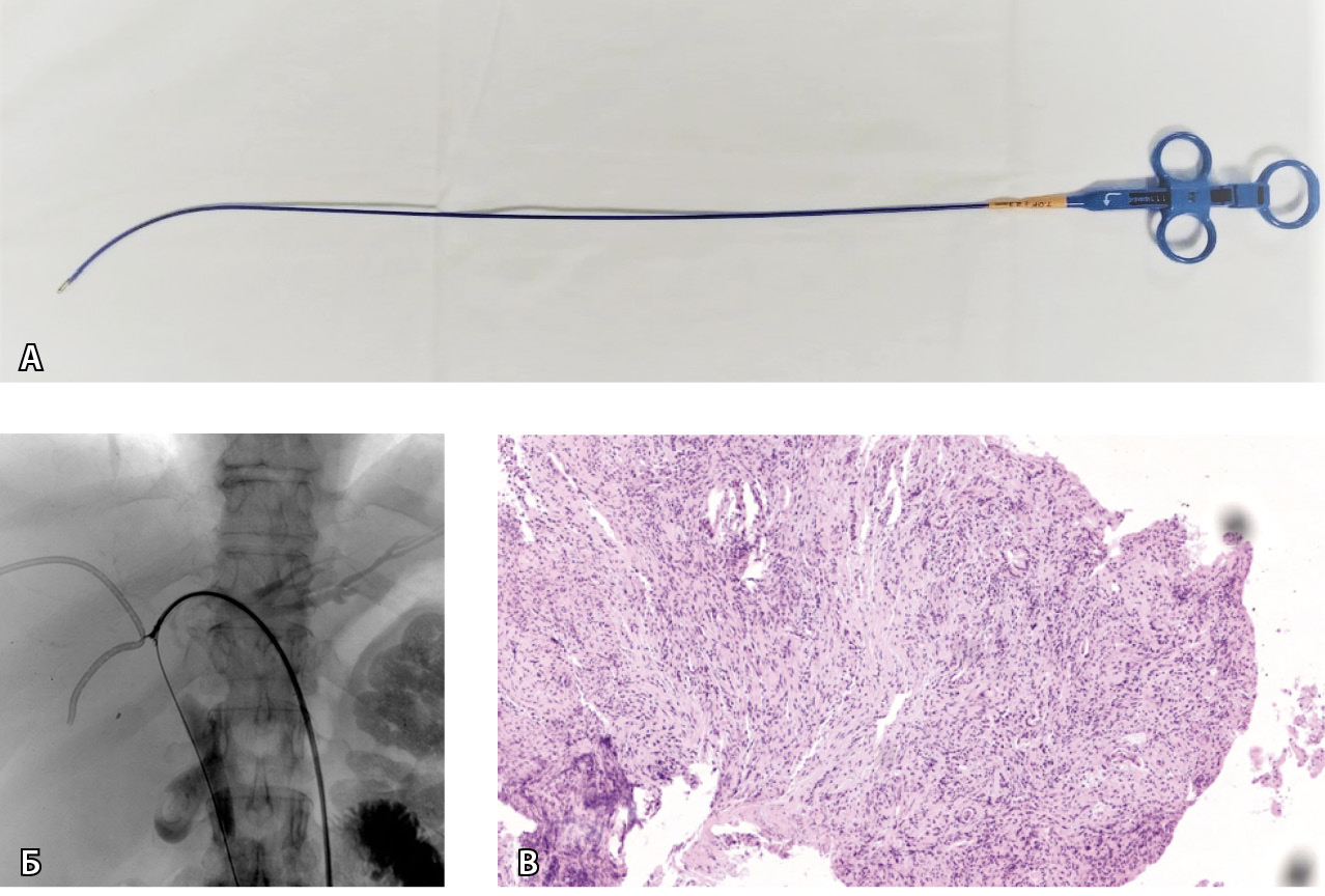 Рис. 1. Щипковая биопсия у пациента с опухолью Клацкина, Bismuth IV. А – рентгеноконтрастные изгибаемые/вращающиеся биопсийные щипцы Cordis BIPAL 7 F (2,33 мм) длиной 50 см. Б – холангиография с последующей щипковой биопсией опухоли общего печеночного протока из левого доступа. Видны раскрытые бранши щипцов. В – биопсийный материал. Фрагмент стенки желчного протока с разрастанием низкодифференцированной аденокарциномы (окраска гематоксилином и эозином; × 6)
