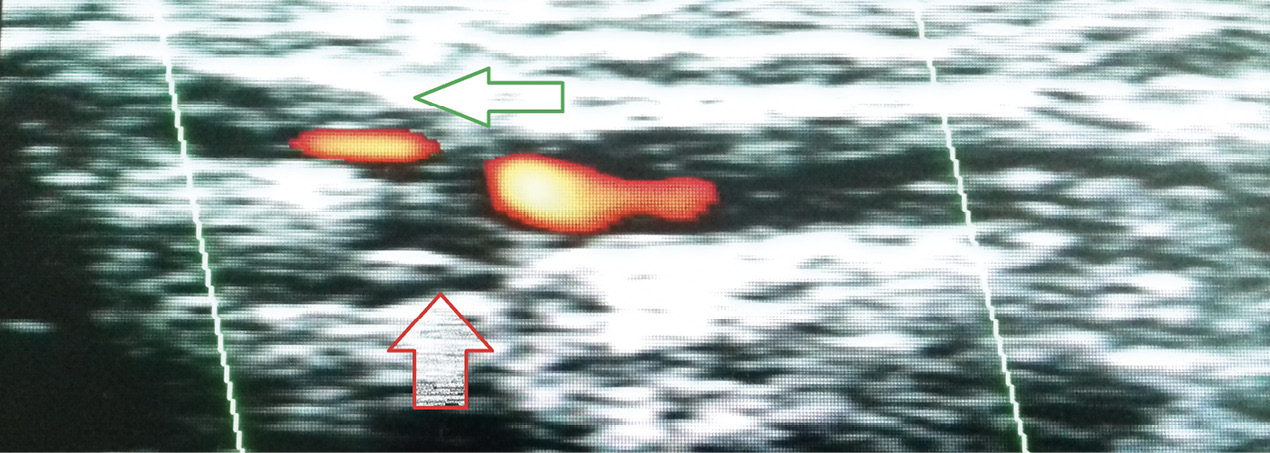 Рис. 4. Окклюзия дистальных отделов лучевой артерии по данным выполненного на 5-е сутки ультразвукового исследования артерии доступа (указана красной стрелкой), кровоток в поверхностной ладонной ветви лучевой артерии (указана зеленой стрелкой) сохранен [17]