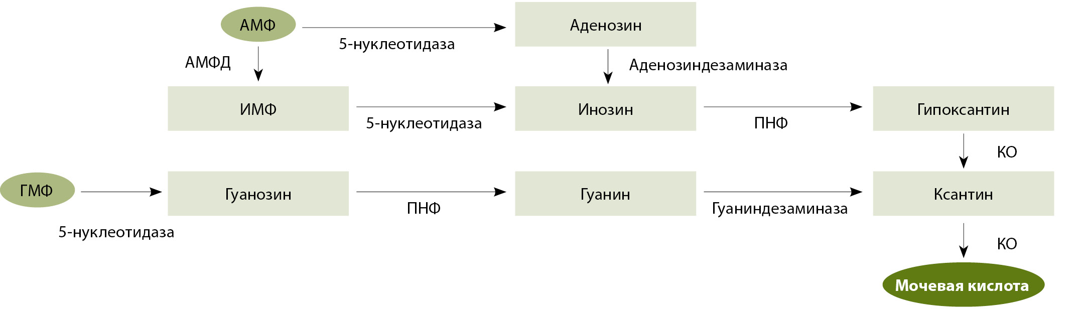 МК является конечным продуктом метаболизма пуринов. Большая часть – 70% – пуринов образуется в результате эндогенного метаболизма, а остальные 30% поступают с пищей [14].