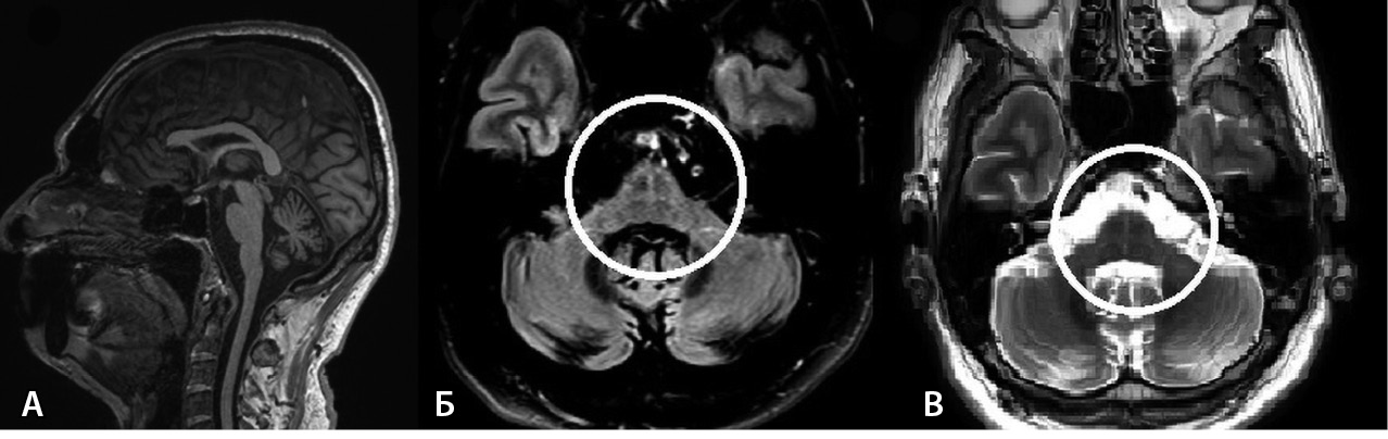 Рис. 1. Магнитно-резонансная томография головного мозга пациента В. А – Т1-взвешенное изображение, сагиттальный срез: признаки атрофии варолиева моста в виде уплощения его основания, а также расширение борозд мозжечка. Б, В – Т2-FLAIR, Т2-взвешенное изображение, аксиальные срезы: симптом «креста», или “hot cross bun”: гиперинтенсивность волокон мосто-мозжечковых путей и ядер шва (отмечено кругом)