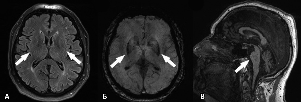 Рис. 2. Магнитно-резонансная томография головного мозга пациента А. А – Т2-FLAIR, аксиальный срез: симметричные линейные участки повышенного сигнала от скорлупы (отмечено стрелками). Б – SWI, аксиальный срез: симметрично сниженная интенсивность сигнала от скорлупы (отмечено стрелками). В – Т1-взвешенное изображение, сагиттальный срез: признаки атрофии варолиева моста, мозжечка (отмечено стрелкой)