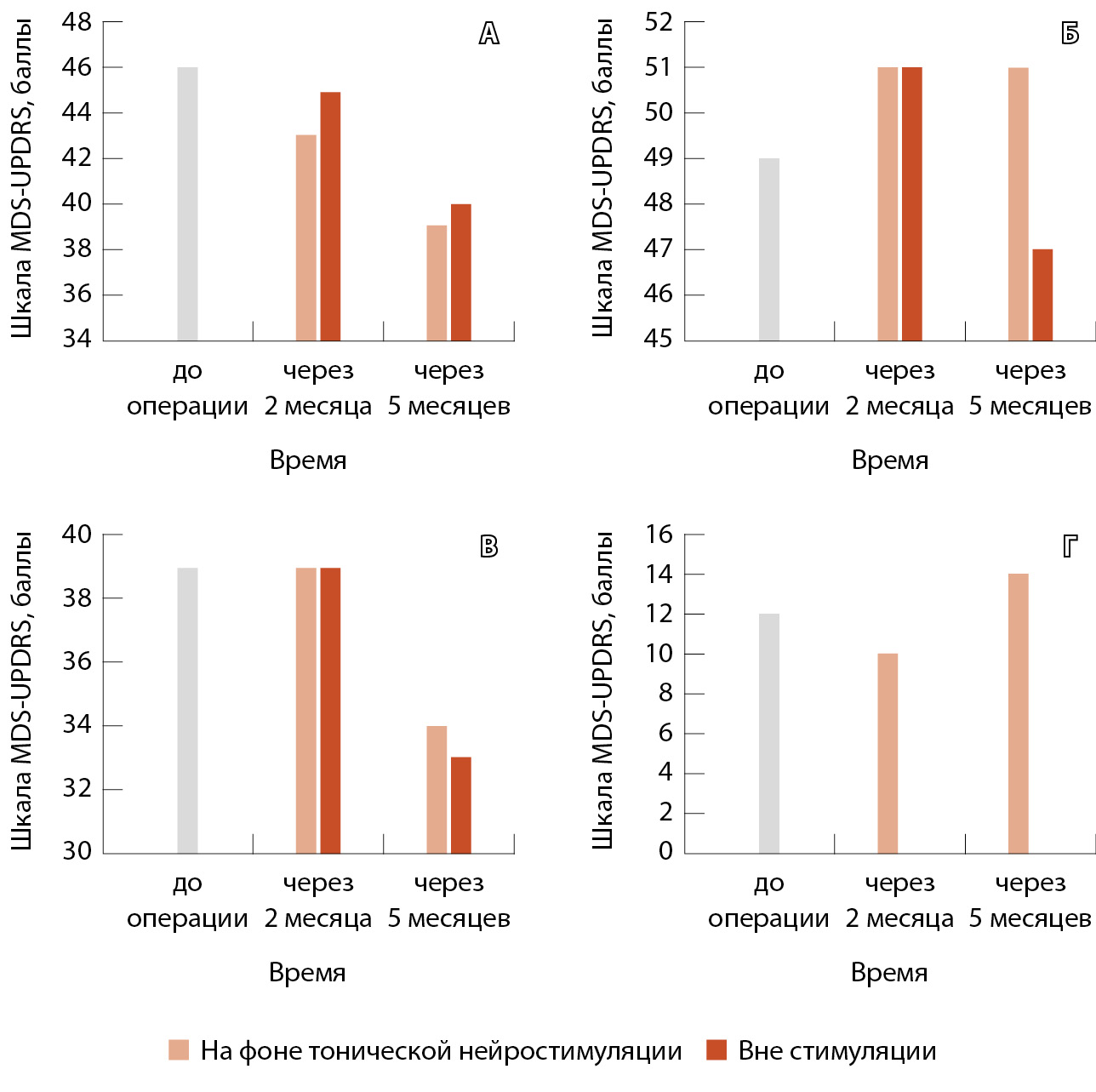 Рис. 1. Оценка по шкале MDS-UPDRS; часть III: А – пациент 1; Б – пациент 2; В – пациент 3; Г – пациент 4